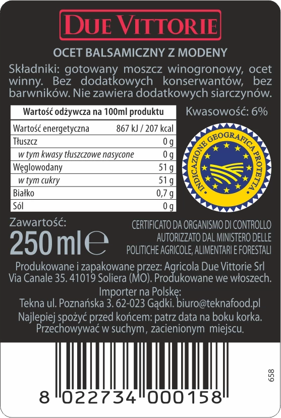 Dzięki mistrzowskiemu połączeniu moszczu winogronowego z Emilia Romagna, poddanemu naturalnej fermentacji i powolnemu dojrzewaniu oraz octu winnego, powstaje Ocet Balsamiczny Due Vittorie Argento z Modeny. Wyróżnia się on klasycznym smakiem oraz ulotnym, umiarkowanie cierpkim aromatem.